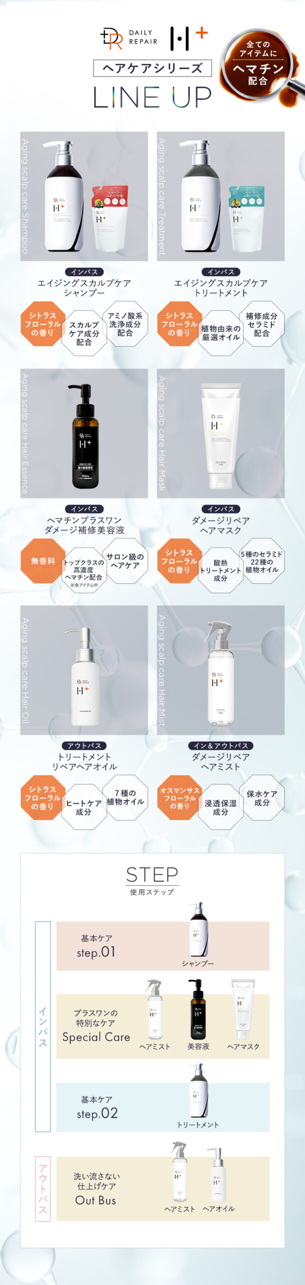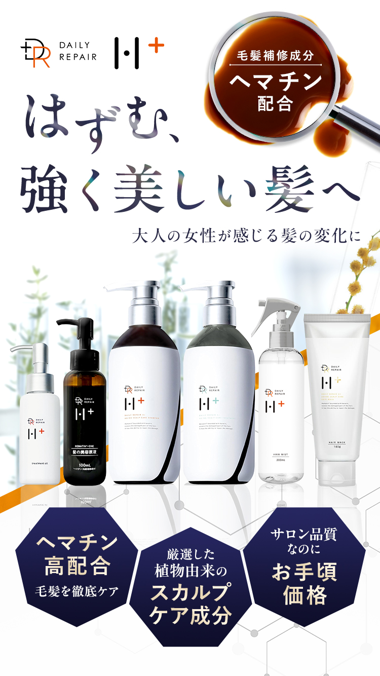 ヘマチンを中心とした高機能処方で、ツヤ・まとまり・ボリュームのある美髪へ。